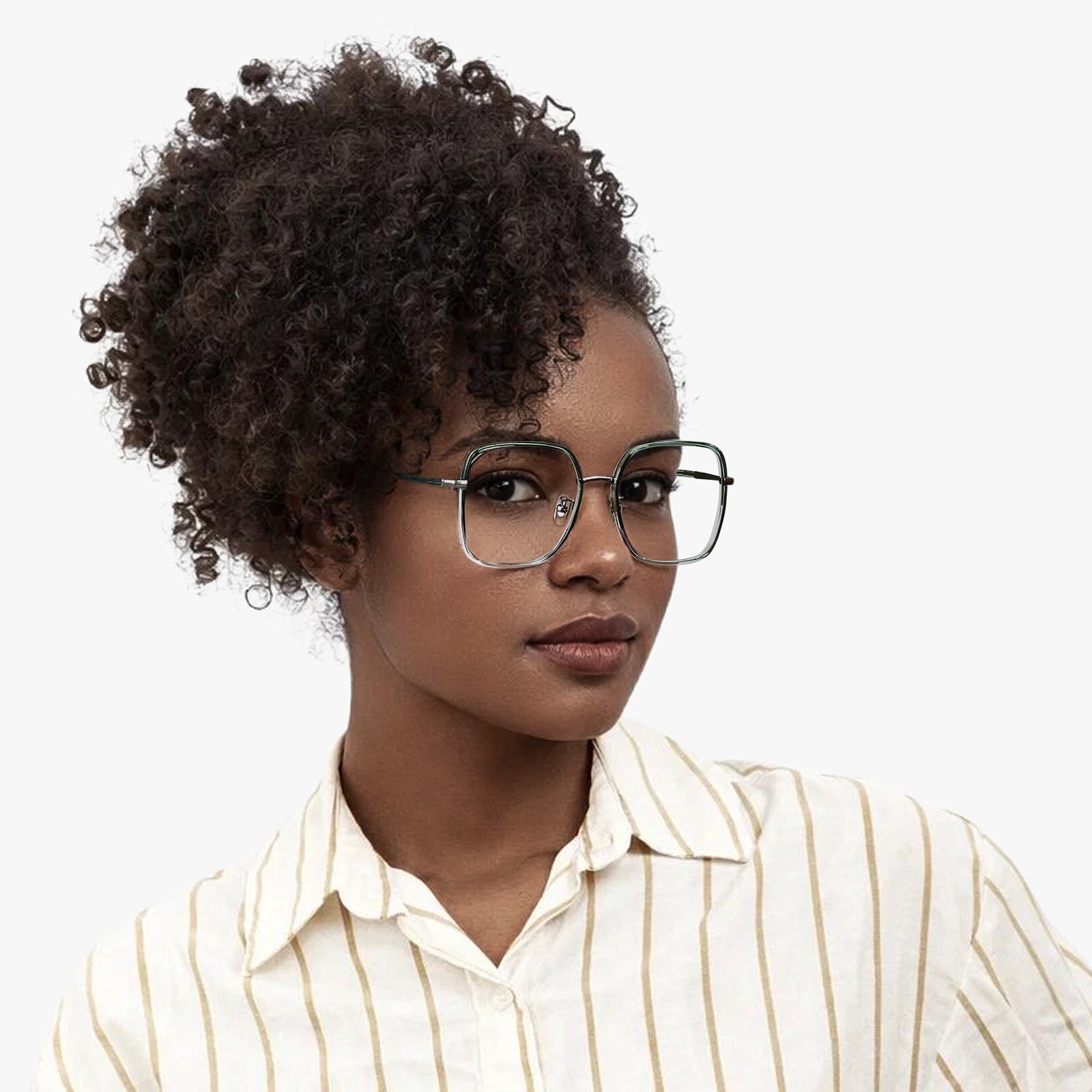 With a cool, translucent tone, Ruth crystal blue green gun introduces color in a fresh yet measured way. Gunmetal detailing grounds the design, while the square structure adds clarity and presence — stylish without trying too hard.